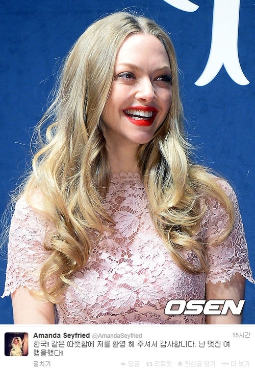 아만다 사이프리드는 지난 7일(한국시간) 자신의 트위터에 "한국! 같은 따뜻함에 저를 환영 해 주셔서 감사합니다. 난 멋진 여행을했다!"라는 글을 올렸다.