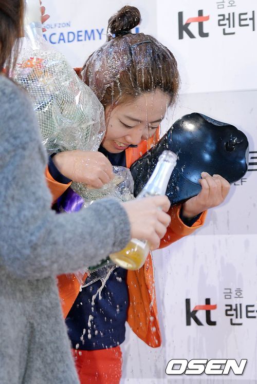 이순호 프로가 8일 오전 경기도 시흥 화인골프클럽에서 진행된 '2013-14 kt금호렌터카 WGTOUR 윈터시즌 2차대회' 최종라운드에서 총합 -11언더파로 역전 우승을 거머쥔 뒤 샴폐인 세례를 받고 있다.