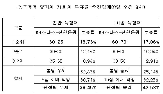 국민체육진흥공단(www.kspo.or.kr)이 발행하는 체육진흥투표권 수탁사업자인 스포츠토토의 공식 온라인 발매 사이트 베트맨(www.betman.co.kr)이 오는 9일 오후 7시 청주종합체육관에서 벌어지는 WKBL KB스타즈-신한은행전 대상 농구토토 W매치 71회차 게임 투표율을 중간 집계한 결과, 국내 농구팬들의 42.58%는 여자농구의 강자 신한은행의 승리를 예상하는 것으로 나타났다.