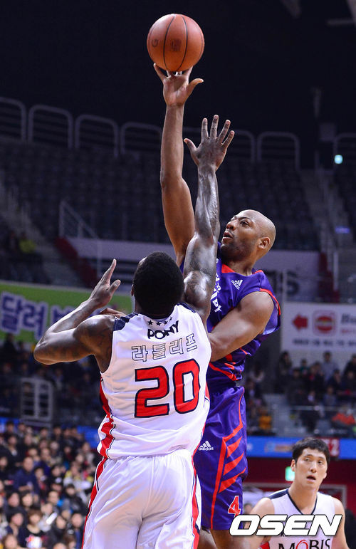 8일 오후 고양시 고양체육관에서 열린 '2013-2014 KB국민카드 프로농구' 고양 오리온스와 울산 모비스의 경기 1쿼터 윌리엄스가 라틀리프를 앞에두고 슛을 시도하고 있다.