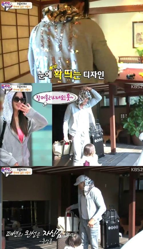 '슈퍼맨' 추성훈이 걸그룹 소녀시대 서현과 같은 반짝이 트레이닝복 패션으로 눈길을 끌었다.