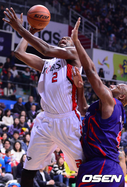 8일 오후 고양시 고양체육관에서 열린 '2013-2014 KB국민카드 프로농구' 고양 오리온스와 울산 모비스의 경기 3쿼터 벤슨이 윌리엄스를 피해 슛을 시도하고 있다.
