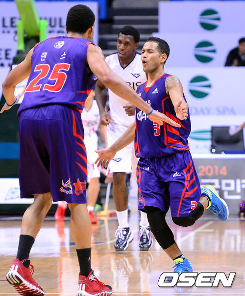 8일 오후 고양시 고양체육관에서 열린 '2013-2014 KB국민카드 프로농구' 고양 오리온스와 울산 모비스의 경기 4쿼터 전태풍이 3점슛을 성공시킨 후 랜스와 하이파이브를 하고 있다.