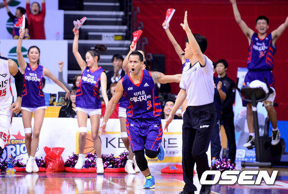 8일 오후 고양시 고양체육관에서 열린 '2013-2014 KB국민카드 프로농구' 고양 오리온스와 울산 모비스의 경기 4쿼터 전태풍이 3점슛을 성공시킨 후 환호하고 있다.