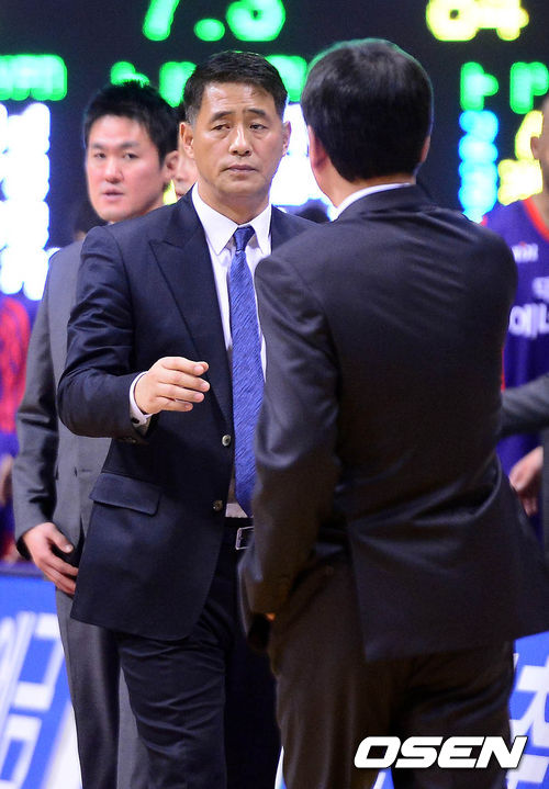 8일 오후 고양시 고양체육관에서 열린 '2013-2014 KB국민카드 프로농구' 고양 오리온스와 울산 모비스의 경기 종료 후 추일승 감독과 유재학 감독이 악수를 나누고 있다.