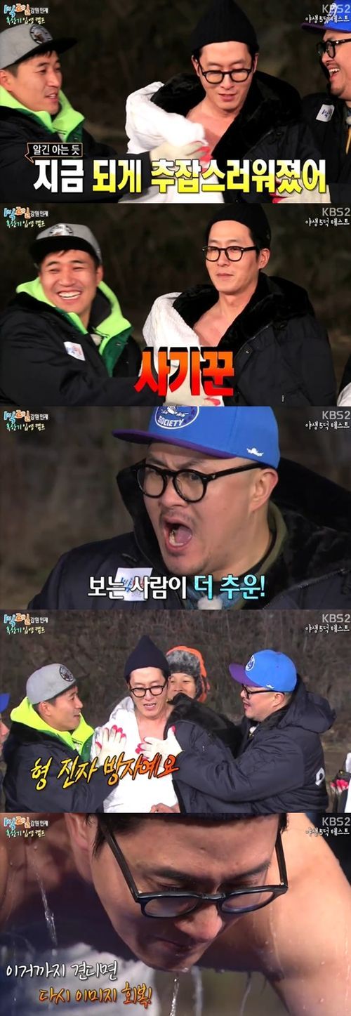 또한 멤버들은 등목을 해야하는 3단계 테스트에서 김주혁을 추천했다. 김주혁은 "나는 냉탕도 안 간다. 나는 몸이 더럽다"라고 완강하게 거부했지만, 데프콘은 "그럼 씻어야 한다"라고 그의 발목을 잡았다. 이에 김주혁과 김준호가 영하의 날씨에서 등목을 하게 됐다. 김주혁은 계속해서 오만상을 쓰며 이날 계속된 불운의 연속에 어이없어 했다.