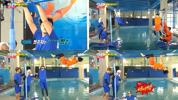 이날 박희순은 김종국, 하하와 같은 팀이 돼 첫 번째 미션 '올킬 철봉게임'을 진행했다. 가장 먼저 미션 장소에 도착한 박희순 팀은 부전승으로 결승에 올라갔고, 유재석, 공유, 이광수와 대결을 벌였다.