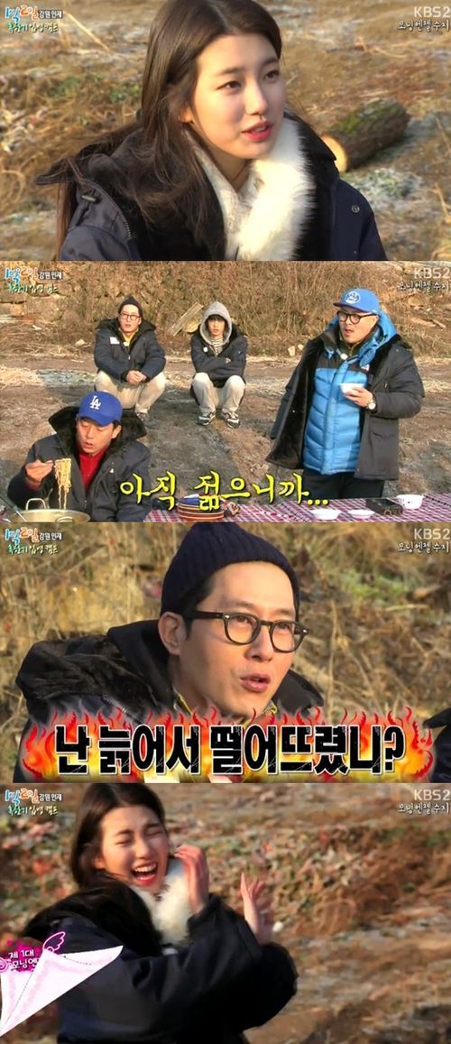 하지만 수지는 먼저 김종민을 선택했다. 기쁨에 깨방정을 떨던 김종민은 간밤에 파놓은 얼음물에 빠지는 참사를 당해야했다. 이어 수지가 데프콘을 선택하자 멤버들은 "이거 가수 선배 순서인 것 같다"라고 불만을 표출했다.