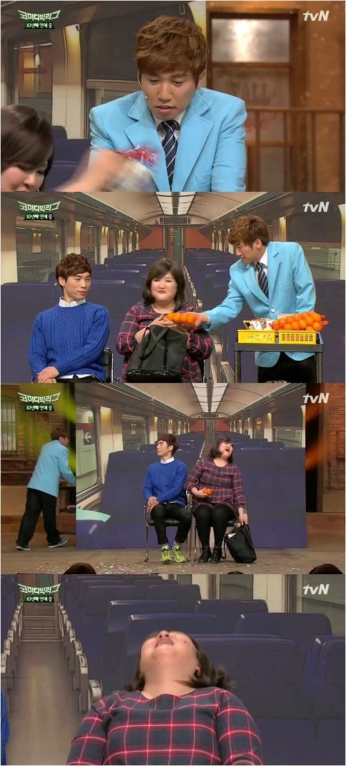 유세윤은 8일 방송된 tvN 코미디 프로그램 ‘코미디 빅리그’의 코너 ‘10년째 연애중’에서 이국주가 3만 원어치 과자를 구입하자 귤을 공짜로 줬다. 유세윤은 기차에서 음식을 판매하는 직원을 연기했다.