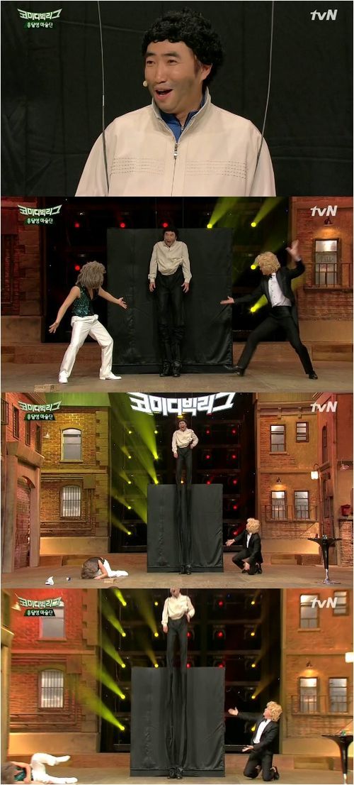 이 코너는 허무맹랑한 거짓 마술로 웃음을 선사하는 코너. 이날 유상무는 “여러분이 믿으면 이 사람의 키가 17m까지 큰다”고 장담했다. 장동민은 공중에 뜰 수 있는 장치를 한 채 부양했다. 장동민이 공중에 부양하면 바지가 늘어나서 마치 진짜 키가 17m인 것처럼 보이는 것.