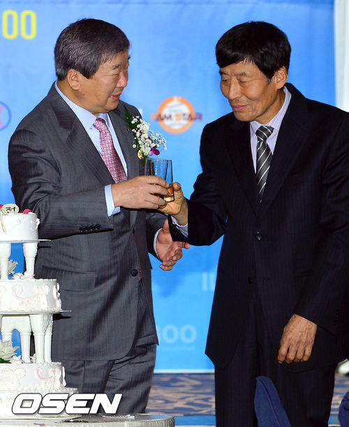 9일 오후 서울 청담동 리베라호텔 베르사이유 홀에서 진행된 '2013 일구대상' 시상식에서 일구대상을 수상한 박찬호 아버지 박재근씨가 KBO 구본능 총재와 건배를 하고 있다.