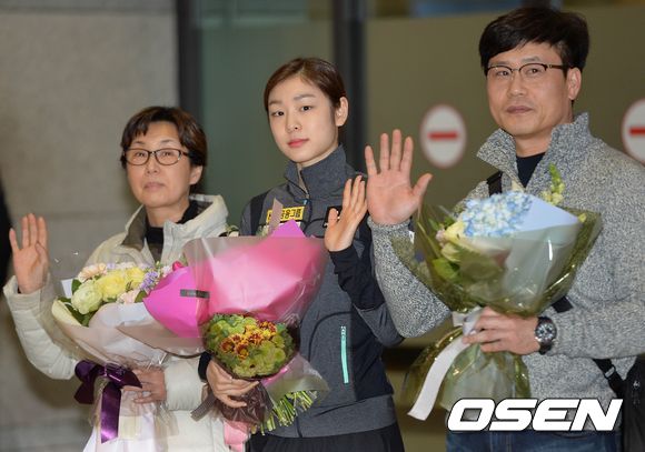 '피겨여왕' 김연아와 신혜숙, 류종현 코치가 9일 오후 크로아티아에서 열린 '2013 골든 스핀 오브 자그레브'에서 우승을 차지한 뒤 인천공항을 통해 귀국해 취재진과 팬들을 향해 인사하고 있다.