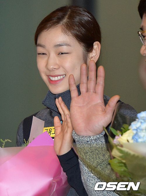 '피겨여왕' 김연아와 신혜숙, 류종현 코치가 9일 오후 크로아티아에서 열린 '2013 골든 스핀 오브 자그레브'에서 우승을 차지한 뒤 인천공항을 통해 귀국해 취재진을 향해 인사하고 있다.