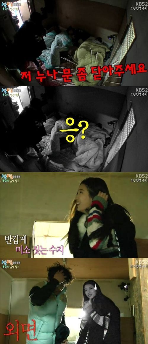 잠에서 덜 깬 1박2일 멤버 정준영은 "누나, 문 좀 닫아 주세요"라고 말했고, 차태현과 김주혁 등 다른 멤버들도 수지를 보고 그냥 지나쳐 그녀를 당황하게 만들었다.