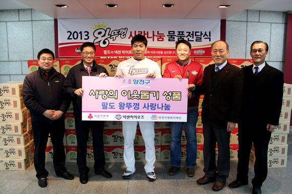 넥센 히어로즈(대표이사 이장석)는 9일(월) 오후 14:30 목동야구장에서 ‘양천사랑복지재단’에 2013시즌 동안 적립된 ‘왕뚜껑 홈런존’ 성금을 전달했다.
