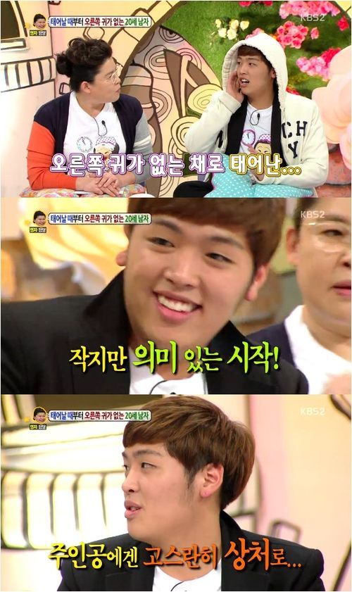 오른쪽 귀가 없는 20세 남자는 9일 방송된 KBS 2TV 예능프로그램 ‘안녕하세요’에서 “난 귀 한쪽이 없다”면서 “20살이 됐는데 이제 외톨이처럼 지내기 싫다”고 방송에 출연한 이유를 설명했다.