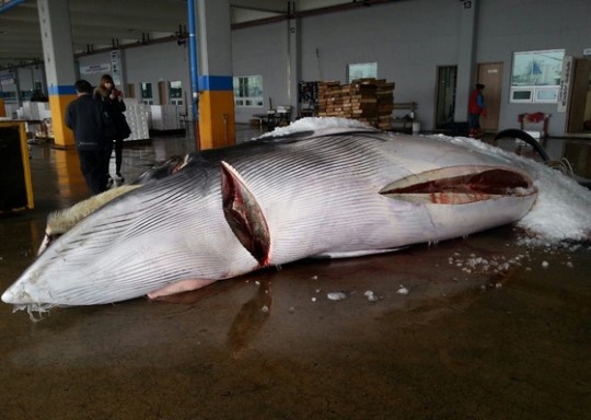 던져둔 그물을 끌어올리려다 발견된 이 고래는 밍크고래로 알려졌으며, 길이 7m 45㎝, 둘레 4m 60㎝, 무게 4.7톤에 달한다고.