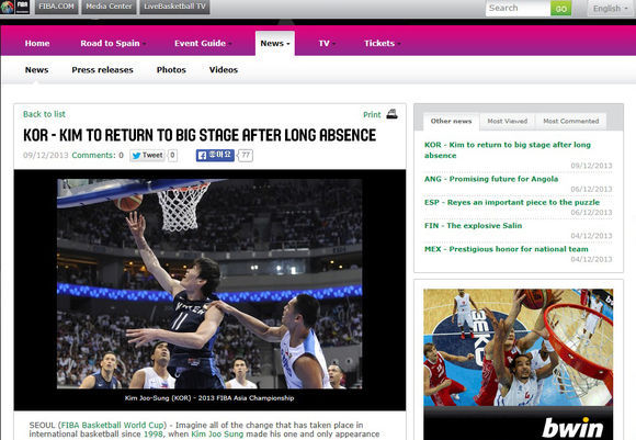 국제농구연맹(FIBA) 공식홈페이지는 10일(이하 한국시간) ‘김주성이 오랜 공백 끝에 큰 무대로 돌아온다’는 제목의 기사에서 김주성의 소식을 비중 있게 다뤘다. 김주성은 지난 1998년 그리스 아테네에서 열린 세계농구선수권에 한국대표팀의 막내로 출전했었다. 이후 김주성은 한국농구의 기둥으로 성장했지만 대표팀은 국제무대와 전혀 인연이 없었다.