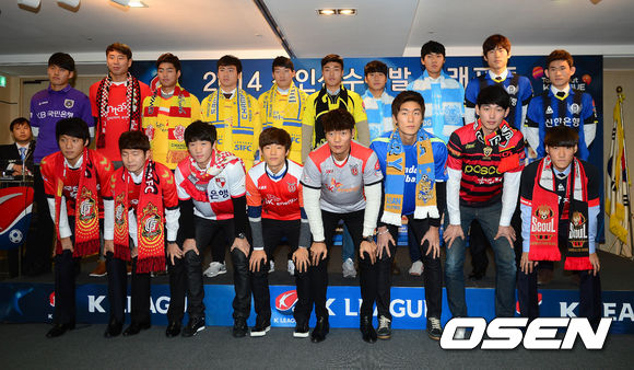 10일 오후 서울 신문로 축구회관에서 열린 2014년도 K리그 신인선수 지명 드래프트에서 구단 자유선발선수들이 기념촬영을 갖고 있다. 앞줄 왼쪽부터 우주성-송수영(경남), 홍동현(부산), 류승우-김경민(제주), 김용진(울산), 김진영(포항), 심상민(서울). 뒷줄 왼쪽부터 구대영(안양), 박종오(부천), 권수현(광주), 이민우-곽해성(성남), 안용우(전남), 금교진-박성용(대구), 김도혁-김대중(인천).