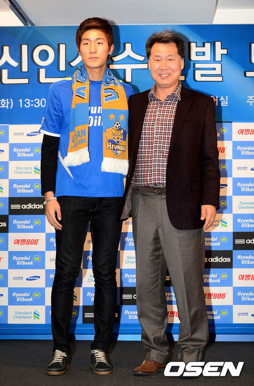 10일 오후 서울 신문로 축구회관에서 열린 2014년도 K리그 신인선수 지명 드래프트에서 울산 자유선발선수 김용진과 조민국 감독이 기념촬영을 갖고 있다.