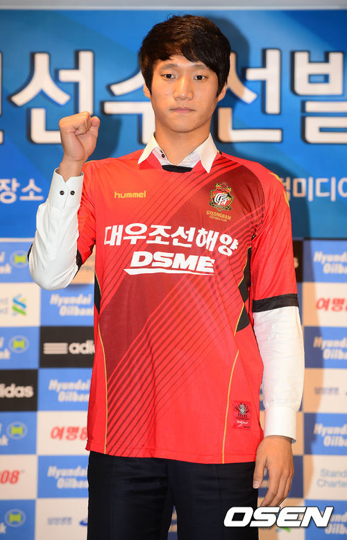 10일 오후 서울 신문로 축구회관에서 열린 2014년도 K리그 신인선수 지명 드래프트에서 경남 자유선발선수 우주성이 기념촬영을 하고 있다.