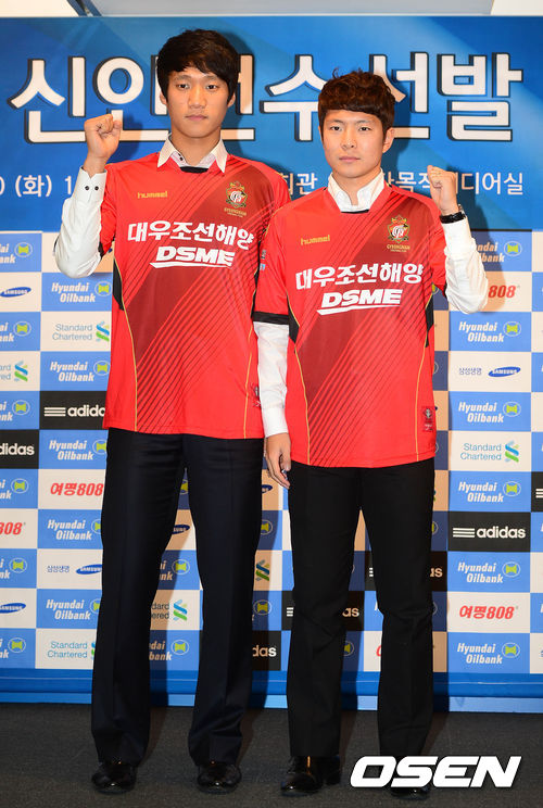 10일 오후 서울 신문로 축구회관에서 열린 2014년도 K리그 신인선수 지명 드래프트에서 경남 자유선발선수 송수영과 우주성이 기념촬영을 하고 있다.