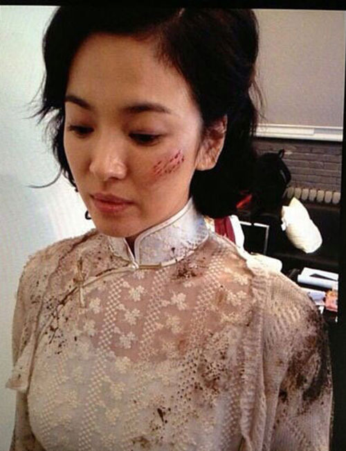 공개된 사진 속 송혜교는 하얀색 치파오 의상에 뚜렷한 이목구비로 시선을 끈다. 하지만 옷이 더렵혀짐은 물론 얼굴에 큰 상처 분장을 하고 있어 힘든 촬영임을 짐작케 한다.