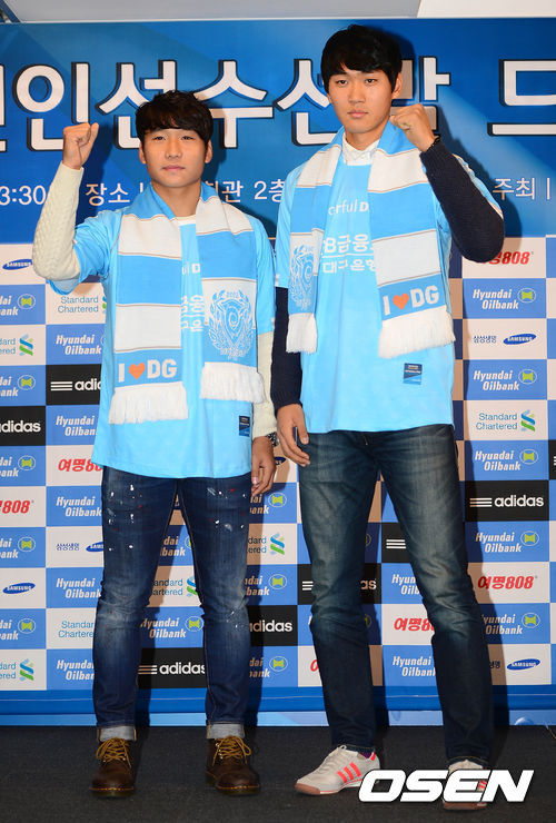 10일 오후 서울 신문로 축구회관에서 열린 2014년도 K리그 신인선수 지명 드래프트에서 대구 자유선발선수 박성용과 금교진이 기념촬영을 하고 있다.