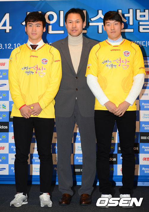 10일 오후 서울 신문로 축구회관에서 열린 2014년도 K리그 신인선수 지명 드래프트에서 성남 안익수 감독이 자유선발선수 곽해성, 이민우와 기념촬영을 하고 있다.