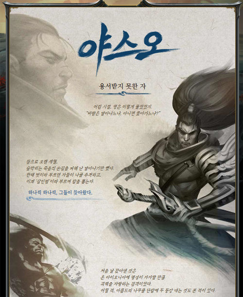 용서받지 못한 자로 소개되고 있는 신규챔피언 '야스오'는 바람의 검술로 상대를 제압하는 근접 딜러. 기동력과 보조 능력이 뛰어나며 전투에서 오래 살아남을수록 적에게 큰 피해를 입힐 수 있다. 게임 초반에는 공격력이 낮은 편이지만 후반으로 갈수록 강력해지면서 적들을 제압한다.