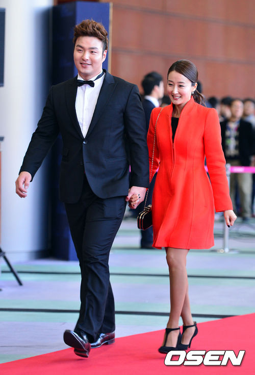 넥센 박병호가 10일 오후 서울 삼성동 코엑스 오디토리움에서 열리는 '2013 한국야쿠르트 세븐 프로야구' 골든글러브 시상식에 부인 이지윤 아나운서와 참석해 레드카펫을 밟은뒤 포즈를 취하고 있다.
