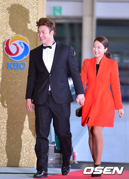 넥센 박병호가 10일 오후 서울 삼성동 코엑스 오디토리움에서 열리는 '2013 한국야쿠르트 세븐 프로야구' 골든글러브 시상식에 부인 이지윤 아나운서와 참석해 레드카펫을 밟은뒤 포즈를 취하고 있다.