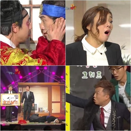 현재 월화극 1위, 수목극 1위를 달리고 있는 '기황후', '상속자들'도 '시청률의 제왕'을 피해갈 수는 없다. 박성광은 자극적인 연출을 위해 영화 '쌍화점'을 언급, 왕 양선일에게 곁에 있는 남자 무사와의 로맨스를 주문해 웃음을 자아냈다. 왕 양선일은 "말하는 것도 천하구나. 지켜주고 싶게"라고 버럭, '상속자들'을 연상케하는 장면을 선보여 관객들을 폭소케했다. 한 스태프가 심의에 걸리겠다고 걱정하자, 박성광은 "피해가 보자. 사실 남장여자다"라고 '기황후'의 설정을 끌어들였다.