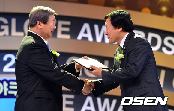 10일 오후 서울 삼성동 코엑스 오디토리움에서 열린 '2013 한국야쿠르트 세븐 프로야구' 골든글러브 시상식에서 KBO 구본능 총재가 강운태 광주광역시장에게 감사패를 전달하고 있다.