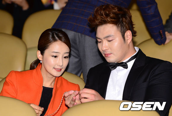 시상식에 앞서 넥센 박병호가 배우자 이지윤씨의 가방끈을 고쳐주고 있다.