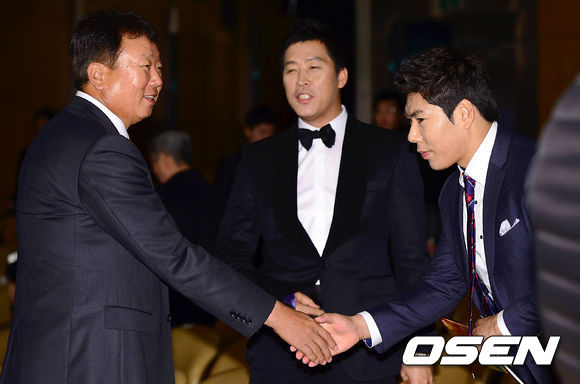 시상식에 앞서 KIA 선동렬 감독이 넥센 강정호와 악수를 나누고 있다.