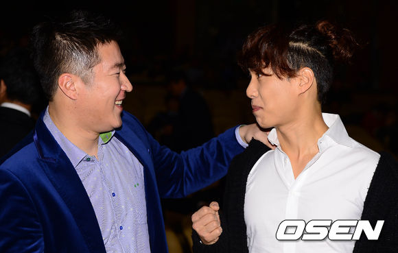 시상식에 앞서 삼성 최형우가 가수 김원준과 반갑게 인사를 나누고 있다.