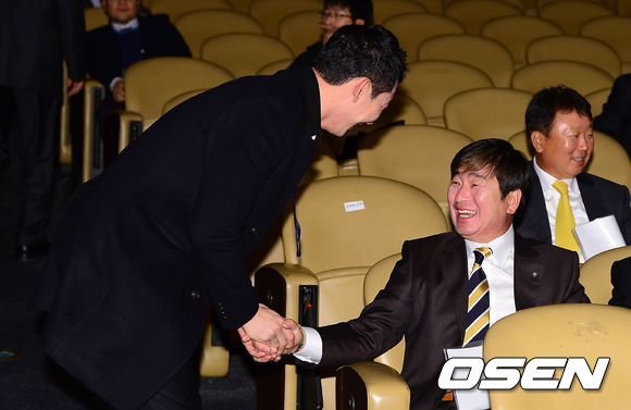 시상식에 앞서 삼성 류중일 감독이 LG 손주인과 반갑게 인사를 나누고 있다.