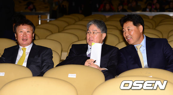 KIA 선동렬, NC 김경문, SK 이만수 감독이 이야기를 나누고 있다.