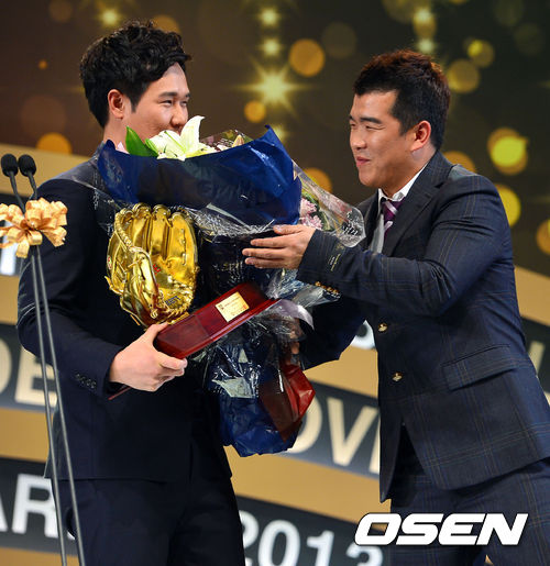 10일 오후 서울 삼성동 코엑스 오디토리움에서 열린 '2013 한국야쿠르트 세븐 프로야구' 골든글러브 시상식에서 SK 최정이 골든글러브 3루수부문상을 수상후 한화 정근우의 축하를 받고 있다. 이후 최정은 소감에서 정근우에 향한 응원 메세지를 전했다.