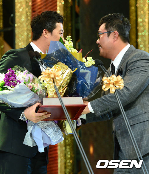 지명타자 부문 골든글러브를 수상한 LG 이병규가 NC 이호준에게 축하를 받고 있다.