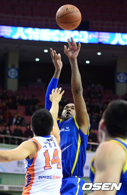 10일 오후 서울 잠실실내체육관에서 열린 '2013-2014 KB국민카드 프로농구' 서울 삼성과 인천 전자랜드의 경기 3쿼터 존슨이 이현호를 앞에두고 슛을 시도하고 있다.