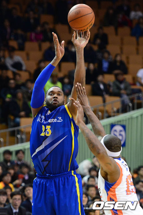 10일 오후 서울 잠실실내체육관에서 열린 '2013-2014 KB국민카드 프로농구' 서울 삼성과 인천 전자랜드의 경기 4쿼터 존슨이 포웰을 앞에두고 슛을 시도하고 있다.
