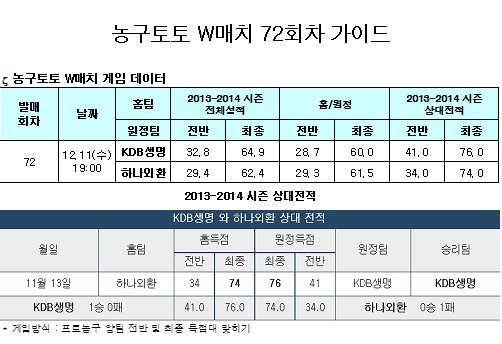국민체육진흥공단(www.kspo.or.kr)이 발행하는 체육진흥투표권 수탁사업자인 스포츠토토 공식 온라인 발매사이트인 베트맨(www.betman.co.kr)이 오는 11일 오후 7시 구리시체육관에서 벌어지는 KDB생명-하나외환전을 대상으로 한 농구토토 W매치 72회차 투표율을 중간 집계한 결과, 참가자의 40.08%는 KDB생명의 승리를 예상하는 것으로 나타났다.