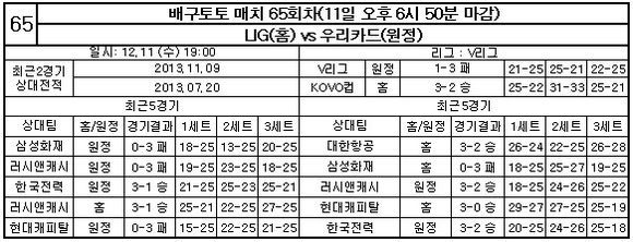 [배구토토] 국민체육진흥공단(www.kspo.or.kr)이 발행하는 체육진흥투표권 수탁사업자인 스포츠토토의 공식 온라인 발매사이트 베트맨(www.betman.co.kr)은 오는 11일 열리는 2013-2014시즌 V-리그 LIG-우리카드전을 대상으로 하는 배구토토 매치 65회차 게임 투표율 중간집계 결과, 배구팬들은 우리카드가 LIG를 상대로 우세한 경기를 펼칠 것으로 예상했다.