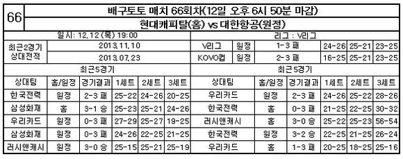 [배구토토] 국민체육진흥공단(www.kspo.or.kr)이 발행하는 체육진흥투표권 수탁사업자인 스포츠토토의 공식 온라인 발매사이트 베트맨(www.betman.co.kr)은 오는 12일 열리는 2013-2014시즌 V-리그 현대캐피탈-대한항공전을 대상으로 하는 배구토토 매치 66회차 게임 투표율 중간집계 결과, 배구팬들은 현대캐피탈이 대한항공을 상대로 우세한 경기를 펼칠 것으로 예상했다.