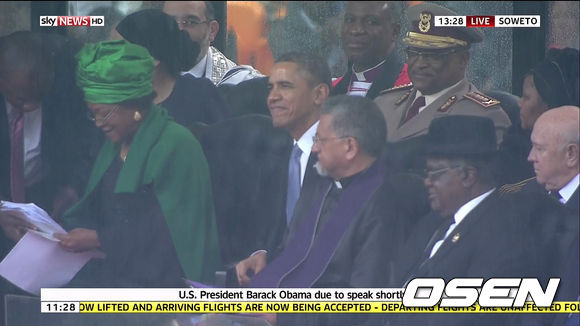 10일(현지시각) 넬슨 만델라 전 남아공 대통령 장례식에 참석한 버락 오바마 미국 대통령은 연설에 나서며 미국과 냉전관계에 있는 쿠바의 라울 카스트로 국가평의회 의장과 악수를 나눴다.