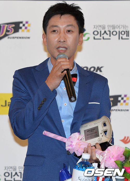 올해의 레이싱팀상을 수상한 CJ레이싱 김의수 감독이 소감을 전하고 있다.