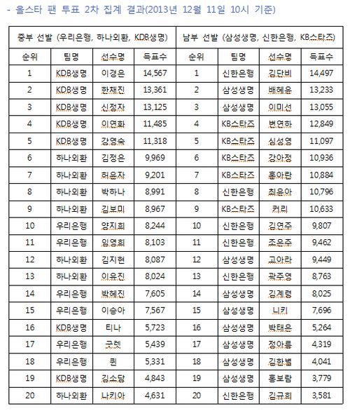 중부선발(우리은행, 하나외환, KDB생명) 이경은은 지난달 20일부터 WKBL 홈페이지에서 실시한 올스타 온라인 팬 투표 2차 집계결과(12월 11일 오전 10시 기준)에서 1만4567표를 득표해 올스타 팬투표 전체 1위를 유지했다. 이경은은 지난 1차 투표 집계에서도 총 8178표를 받아 1위에 올랐다.