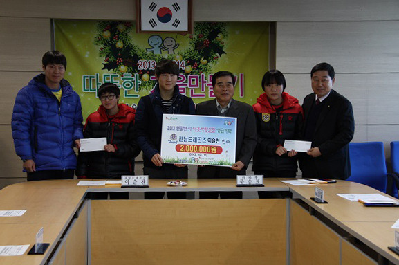 전남 드래곤즈(사장 박세연) 소속 미드필더 이슬찬이 연말연시를 맞아 시민들이 보내준 따뜻한 성원에 보답하고자 (재)광양시사랑나눔복지재단에 이웃사랑실천 성금 200만 원을 기탁했다.